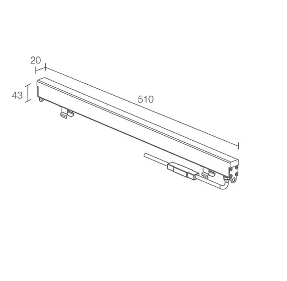 Profilo lineare da esterno, carrabile fino a 5000 kg; a incasso (soffitto, parete, pavimento); corpo in acciaio inox, schermo in PMMA. RGB: 8,5W (Rio 1.1) 24Vdc; incluso cavo in neoprene di 1,5 m H05RN-F 2x0,35/0,75 Ø6,3 mm; RGB: incluso cavo in FEP+PCP (equivalente a H05RN-F) di 1,5 m 4x0,50/0,50 Ø6,3 mm; RGB: R 22 lm (Rio 1.1), G 64 lm (Rio 1.1), B 14 lm (Rio 1.1), 28 lm (Rio 1.1); ottica diffusa; colore LED: RGB; grado di protezione: IP67; grado di resistenza: IK10; dotato di sistema IPS; temperatura di esercizio: -10°C +45°C; temperatura schermo: max 40°C (Ta 25°C); sicurezza fotobiologica: gruppo rischio 1 secondo EN62471:2009; classe di isolamento III; peso: 0,70 kg/m; dimensioni 510x20x43mm (Rio 1.1). dimmerazione disponibile mediante dimmer in linea 24Vdc; accessori: cassaforma in alluminio WC8111 (Rio 1.1). Cassaforma per cartongesso WC8311 (Rio 1.1). Cassaforma in acciaio inox WC8151 (Rio 1.1). Ottiche: diffusa. Dimensione: 510x20x43 mm.