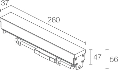Profilo lineare da esterno, carrabile fino a 5000 kg* (solo con cassaforma in alluminio); a incasso (soffitto, parete, pavimento); corpo in PMMA, testate in acciaio inox AISI 316L, schermo in PMMA opalino. 5W. 2800K. L=260 mm. 145 lm
