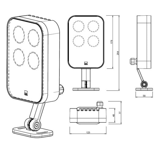 Proiettore orientabile da esterno; 16W - 230Vac 50Hz; 4 power LED; 3000K; CRI: 75÷85; ottica: 40°; flusso totale: 925 lm (3000K); corpo in pressofusione di alluminio in lega EN AW 47100; schermo in vetro temprato e serigrafato; finitura: bianco opaco RAL9003; temperatura di esercizio: -10°C +45°C; temperatura vetro: max 40°C (Ta 25°C); IPS integrato nel pressacavo; PCB tropicalizzati; NTC controllo della temperatura a bordo; grado di protezione contro i liquidi e i corpi solidi: IP66; grado di resistenza all'impatto IK06; Glow wire test: 960°; sicurezza fotobiologica: gruppo rischio 1 secondo EN62471:2006; montaggio su superfici fissando la piastra con viti e tasselli, a terra tramite picchetto opzionale; classe di isolamento I (230Vac); peso 1,60kg; dimensioni 254x123x77mm; collegamento 230Vac 50Hz; alimentatore integrato; accessori disponibili: picchetto WP0300, nido d'ape WH5020, schermo antiabbagliamento WB5020H.