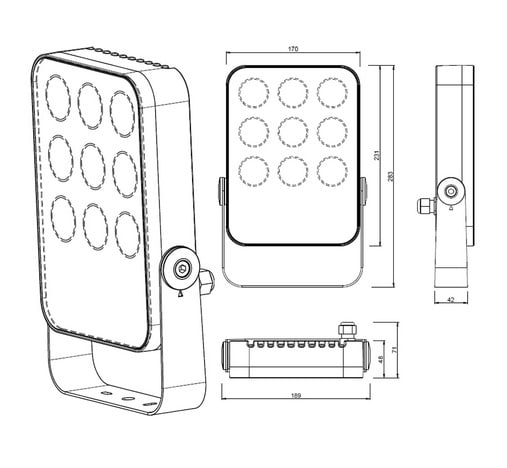 Proiettore orientabile da esterno; 23W - 230Vac 50Hz; 9 power LED; 4000K; CRI: 75÷85; ottica: 40°; corpo in pressofusione di alluminio in lega EN AW 47100; schermo in vetro temprato e serigrafato; finitura: antracite; temperatura di esercizio: -10°C +45°C; temperatura vetro: max 40°C (Ta 25°C); IPS integrato nel pressacavo; PCB tropicalizzati; NTC controllo della temperatura a bordo; grado di protezione contro i liquidi e i corpi solidi: IP66; grado di resistenza all'impatto IK06; Glow wire test: 960°; sicurezza fotobiologica: gruppo rischio 1 secondo EN62471:2006; montaggio su superfici fissando la piastra con viti e tasselli, a terra tramite picchetto opzionale; classe di isolamento I (230Vac); peso 2,10kg; dimensioni 283x89x77mm; collegamento 230Vac 50Hz; dimmerazione disponibile mediante 0-10V; alimentatore integrato; accessori disponibili: picchetto WP0300, nido d'ape WH5030, schermo antiabbagliamento WB5030H.