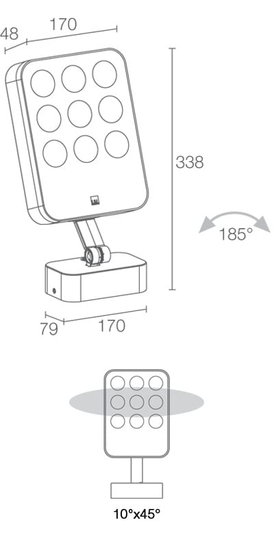 Proiettore da esterno; su superficie (soffitto, parete, pavimento, picchetto); corpo in alluminio pressofuso lega EN AB 47100, schermo in vetro extra chiaro, temprato e serigrafato. 23W. 4000K. 10°x45°.grigio. 2214 lm