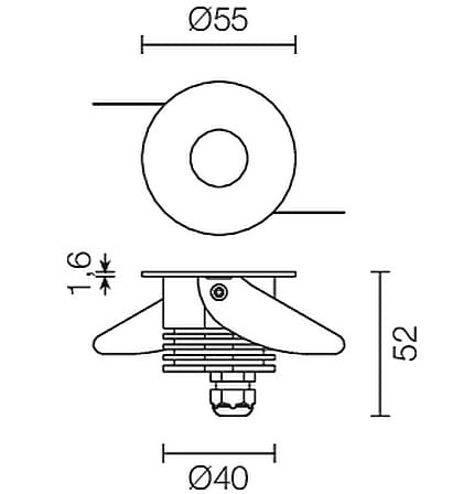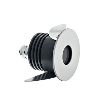 Segnapasso da interno o esterno; 2W - 350/500mA; 3000K; CRI: 75÷80; ottica diffusa non abbagliante; flusso totale: 44 lm (3000K a 500mA); corpo in lega di alluminio, ghiera Acciaio Inox verniciato; finitura: bianco; temperatura di esercizio: 0°C +45°C; dotato di sistema IPS (utilizzare corrugato Ø20 min) e di sistema EPS; grado di protezione contro i liquidi e i corpi solidi: IP65; sicurezza fotobiologica: gruppo rischio 1 secondo EN62471:2006; montaggio con le molle presenti sul corpo su foro in cartongesso o con cassaforma WC1500/WC1501; classe di isolamento III; peso 0,25kg; dimensioni Ø55x55mm; foro d'incasso: Ø45mm; volume d'ingombro Ø70x90mm; collegamento in serie, cablato con cavo 1,5m tipo H05RN-F 2x0,75; dimmerazione disponibile mediante alimentatore dimmerabile; accessori disponibili: cassaforma WC1500/WC1501.