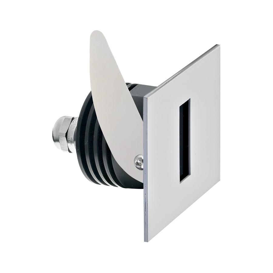 Segnapasso da esterno; a semi-incasso (parete); corpo e ghiera in alluminio; schermo in vetro extrachiaro trasparente. 2W. 500 mA. 3000 K.nero. 145 lm. Assymetrica. Step Outside 6.3: 25 lm