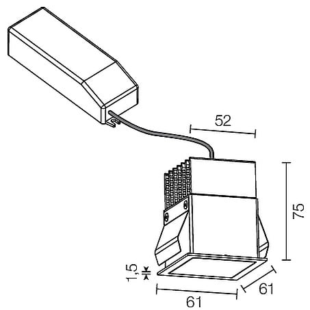 Apparecchio a incasso da interno; 12,5W - 230Vac 50Hz; 1 power LED Multi-chip; 3000K, CRI: >80; luce diffusa; flusso totale: 1003 lm (3000K); corpo in alluminio lega EN AW 6012 con trattamento di anodizzazione nera, cornice in lamiera verniciata bianco opaco Ral9003, schermo in PMMA ad alta riflettanza; finitura: bianco; temperatura di esercizio: 0°C +45°C; grado di protezione contro i liquidi e i corpi solidi: IP40, IP44 installato; sicurezza fotobiologica: gruppo rischio 1 secondo EN62471:2006; montaggio a incasso con molle, disponibile cassaforma WC3103 per installazione in muratura; classe di isolamento II; peso 0,30kg; dimensioni 61x61x75mm; foro d'incasso 56x56mm; volume d'ingombro 140x140x130mm; collegamento 230Vac 50Hz, cablato con alimentatore; dimmerazione disponibile mediante PUSH; in dotazione: alimentatore cablato, ad alta efficienza e PFC attivo; dimensioni alimentatore: 168x37x33mm, 111x52x22mm (1-10V + PUSH), 207x42x31mm (DALI + PUSH); accessori disponibili: cassaforma per muratura WC3101.