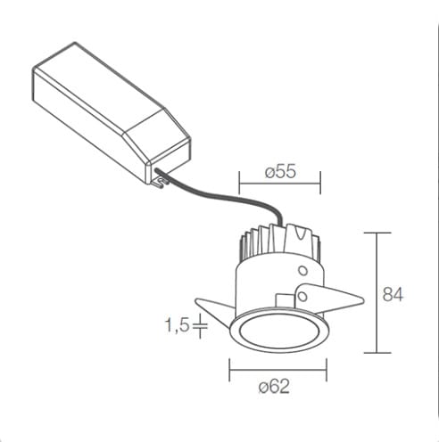 Turis 1.1 - Incasso downlight da interno; a incasso (soffitto); corpo in alluminio anodizzato lega EN AW 6082, ghiera in lamiera, schermo in policarbonato monosatinato; finitura: bianco; 1 power LED multichip; 12,5W - 230Vac; alimentatore incluso e cablato; incluso cavo di 0,30 m; ottica diffusa; colore LED: bianco - 2700K; grado di protezione: IP40, IP44 installato; temperatura di esercizio: 0°C +45°C; temperatura schermo: max 40°C (Ta 25°C); sicurezza fotobiologica: gruppo rischio 1 secondo EN62471:2006; classe di isolamento II; peso 0,30 kg; dimensioni ø62x84 mm; foro d'incasso ø57 mm; volume tecnico per dissipazione: ø130x130 mm; dimmerazione disponibile mediante DALI, 1-10V, PUSH, taglio di fase; accessori: cassaforma per muratura WC3105. LED bianco 12,5W 2700K.