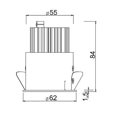 Apparecchio a incasso da interno; 12,5W - 230Vac 50Hz; 1 power LED Multi-chip; 3000K; CRI: >80; luce diffusa; flusso totale: 944 lm (3000K); corpo in alluminio lega EN AW 6012 con trattamento di anodizzazione nera, cornice in lamiera verniciata bianco opaco Ral9003, schermo in PMMA ad alta riflettanza; finitura: bianco; temperatura di esercizio: 0°C +45°C; grado di protezione contro i liquidi e i corpi solidi: IP40, IP44 installato; sicurezza fotobiologica: gruppo rischio 1 secondo EN62471:2006; montaggio a incasso con molle o con cassaforma WC3105; classe di isolamento II; peso 0,30kg; dimensioni Ø62x84mm; foro d'incasso Ø57mm; volume d'ingombro Ø130x130mm; collegamento 230Vac 50Hz, cablato con alimentatore; dimmerazione disponibile mediante PUSH; in dotazione: alimentatore cablato, ad alta efficienza e PFC attivo; dimensioni alimentatore: 168x37x33mm, 111x52x22mm (1-10V + PUSH), 207x42x31mm (DALI + PUSH); accessori disponibili: cassaforma WC3105.