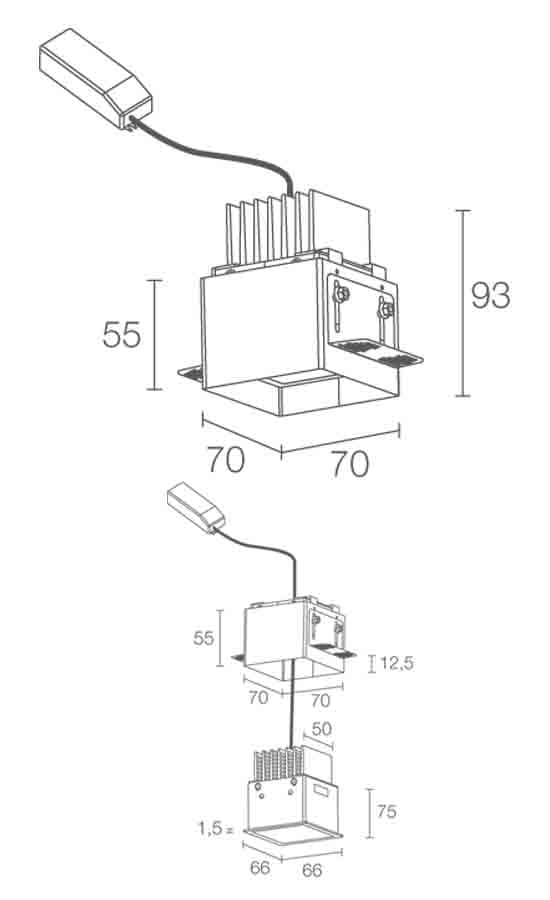 Turis 2.0 - Incasso downlight da interno; a incasso (soffitto); corpo in alluminio anodizzato lega EN AW 6082; ghiera in acciaio, schermo in plexiglass trasparente monosatinato; finiture: bianco; 4 power LEDs; 11W - 230Vac; alimentatore incluso e cablato; incluso cavo di 0,30 m; ottica diffusa; colore LED: bianco - 4000K; grado di protezione: IP40, IP44 installato; temperatura di esercizio: 0°C +45°C; temperatura schermo: max 40°C (Ta 25°C); sicurezza fotobiologica: gruppo rischio 1 secondo EN62471:2006; classedi isolamento II; peso 0,30 kg; dimensioni 66x66x75 mm; foro d’incasso 70x70 mm; volume tecnico per dissipazione: 150x150x140 mm; dimmerazione disponibile mediante 1-10V; accessori: cassaforma per muratura WC3102.