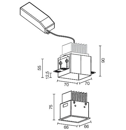 Apparecchio a incasso da interno; 12,5W - 230Vac 50Hz; 1 power LED Multi-chip; 4000K; CRI: >80; luce diffusa; flusso totale: 1003 lm (4000K); corpo in alluminio lega EN AW 6012 con trattamento di anodizzazione nera, cornice in lamiera verniciata bianco opaco Ral9003, schermo in PMMA ad alta riflettanza; finitura: verniciatura in bianco opaco Ral9003; temperatura di esercizio: 0°C +45°C; grado di protezione contro i liquidi e i corpi solidi: IP40, IP44 installato; sicurezza fotobiologica: gruppo rischio 1 secondo EN62471:2006; montaggio a incasso con cassaforma WC3102; classe di isolamento II; peso 0,30kg; dimensioni 66x66x75mm; foro d'incasso 70x70mm; volume d'ingombro 150x150x140mm; collegamento 230Vac 50Hz, cablato all'alimentatore con 30cm di cavo; dimmerazione disponibile mediante 1-10V in dotazione: alimentatore cablato, ad alta efficienza e PFC attivo; dimensioni alimentatore: 168x37x33mm, 111x52x22mm (1-10V + PUSH), 207x42x31mm (DALI + PUSH); accessori disponibili: cassaforma WC3102.