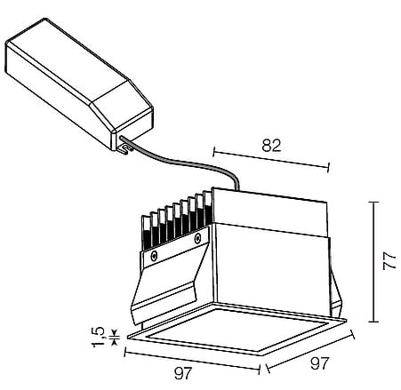 Apparecchio a incasso da interno; 18,5W - 230Vac 50Hz; 1 power LED Multi-chip; 3000K; CRI: >80; luce diffusa; corpo in alluminio lega EN AW 6012 con trattamento di anodizzazione nera, cornice in lamiera verniciata grigio, schermo in PMMA ad alta riflettanza; finitura: grigio; temperatura di esercizio: 0°C +45°C; grado di protezione contro i liquidi e i corpi solidi: IP40, IP44 installato; sicurezza fotobiologica: gruppo rischio 1 secondo EN62471:2006; montaggio a incasso con molle, disponibile cassaforma WC3103 per installazione in muratura; classe di isolamento II; peso 0,50kg; dimensioni 97x97x77mm; foro d'incasso 90x90mm; volume d'ingombro 170x170x130mm; collegamento 230Vac 50Hz, cablato all'alimentatore con 30cm di cavo; dimmerazione disponibile mediante PUSH; in dotazione: alimentatore cablato, ad alta efficienza e PFC attivo; dimensioni alimentatore: 168x37x33mm, 103x67x22mm (1-10V + PUSH), 207x42x31mm (DALI + PUSH); accessori disponibili: cassaforma per muratura WC3103.