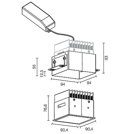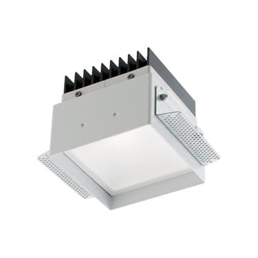 Apparecchio a incasso da interno; 18,5W - 230Vac 50Hz; 1 power LED Multi-chip; 3000K; CRI: >80; luce diffusa; flusso totale: 1463 lm (3000K); corpo in alluminio lega EN AW 6012 con trattamento di anodizzazione nera, cornice in lamiera verniciata bianco opaco Ral9003, schermo in PMMA ad alta riflettanza; finitura: verniciatura in bianco opaco Ral9003; temperatura di esercizio: 0°C +45°C; grado di protezione contro i liquidi e i corpi solidi: IP40, IP44 installato; sicurezza fotobiologica: gruppo rischio 1 secondo EN62471:2006; montaggio a incasso con cassaforma WC3104; classe di isolamento II; peso 0,50kg; dimensioni 91x91x77mm; foro d'incasso 95x95mm; volume d'ingombro 180x180x140mm; collegamento 230Vac 50Hz, cablato all'alimentatore con 30cm di cavo; dimmerazione disponibile mediante PUSH; in dotazione: alimentatore cablato, ad alta efficienza e PFC attivo; dimensioni alimentatore: 168x37x33mm, 103x67x22mm (1-10V + PUSH), 207x42x31mm (DALI + PUSH); accessori disponibili: cassaforma WC3104.