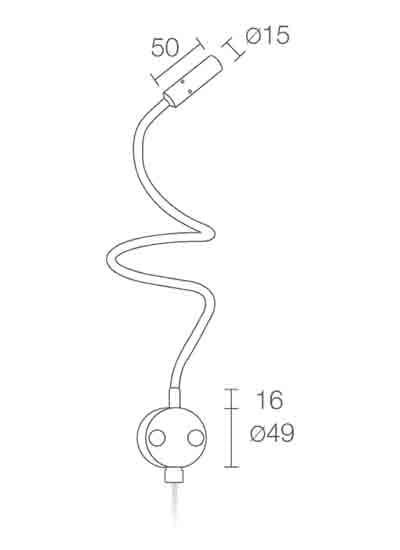 Wall 1 - Lampada da lettura da interno; su superficie (parete); corpo in alluminio, stelo in ottone; finiture: dorato; 1 power LED; 2,5W - 230Vac; alimentatore integrato sulla spina con interruttore sul cavo; incluso cavo di 1,5 m, spina e alimentatore; flusso sorgente: 109 lm (3000K, 2,5W); flusso totale: 28 ÷ 47 lm (3000K, 2,5W); ottica: fascio regolabile; colore LED: bianco - 3000K; grado di protezione: IP20; temperatura di esercizio: 0°C +45°C; temperatura max apparecchio: 40°C; sicurezza fotobiologica: gruppo rischio 1 secondo EN62471:2006; classe di isolamento II; peso 0,30 kg Ø6 - 400mm; dimensioni Ø15x50mm, stelo Ø6/8x400/500mm, piastra Ø49 mm.