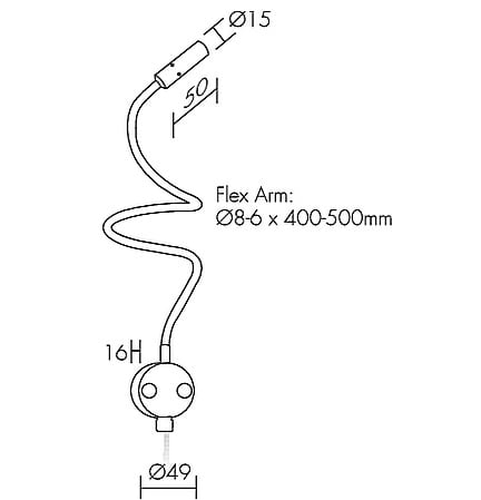 Lampada da lettura; 2W - 230Vac 50Hz; 1 power LED; bianco 3000K; CRI: 75÷85; ottica variabile e regolabile; flusso totale: 83 lm (3000K a 500mA); corpo in lega di alluminio pressofuso EN AB 47100, schermo in PMMA; finitura: cromato; temperatura di esercizio: 0°C +45°C; grado di protezione contro i liquidi e i corpi solidi: IP20; sicurezza fotobiologica: gruppo rischio 1 secondo EN62471:2006; montaggio della basetta con viti e tasselli, possibilità di uscita cavo posteriore; classe di isolamento II; peso 0,30kg Ø6 400mm, dimensioni: Ø15x50mm, stelo flessibile piastrina Ø49mm; collegamento 230Vac 50Hz; alimentatore integrato alla spina.