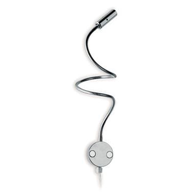 Lampada da lettura; 2W - 230Vac 50Hz; 1 power LED; bianco 3000K; CRI: 75÷85; ottica variabile e regolabile; flusso totale: 83 lm (3000K a 500mA); corpo in lega di alluminio pressofuso EN AB 47100, schermo in PMMA; finitura: dorato; temperatura di esercizio: 0°C +45°C; grado di protezione contro i liquidi e i corpi solidi: IP20; sicurezza fotobiologica: gruppo rischio 1 secondo EN62471:2006; montaggio della basetta con viti e tasselli, possibilità di uscita cavo posteriore; classe di isolamento II; peso 0,32kg Ø8 400mm, dimensioni: Ø15x50mm, stelo flessibile piastrina Ø49mm; collegamento 230Vac 50Hz; alimentatore integrato alla spina.