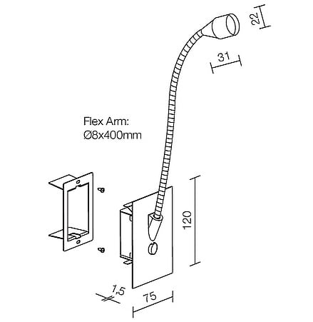 Lampada da lettura; 2W - 230Vac 50Hz; 1 power LED; 3000K; CRI: 75÷85; ottiche: 40°; flusso totale: 103 lm (3000K a 500mA); corpo in alluminio, schermo in PMMA; finitura: cromato con placca bianca; temperatura di esercizio: 0°C +45°C; grado di protezione contro i liquidi e i corpi solidi: IP40; sicurezza fotobiologica: gruppo rischio 1 secondo EN62471:2006; montaggio in scatola standard 503 (WC0301) mediante placca adattatrice; classe di isolamento I; peso 0,34kg; dimensioni ø22x31, stelo flessibile ø8x400mm, piastrina 75x120x1,5mm; collegamento 230Vac 50Hz, con 30cm di cavo bipolare e alimentatore; alimentatore integrato; accessori disponibili: cassaforma WC0301.
