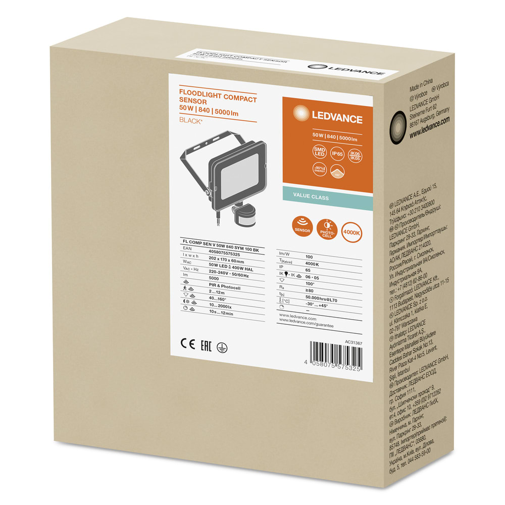LEDVANCE - Faretto LED con sensore, 50W, luce bianca, nero FLCOMP50840BS