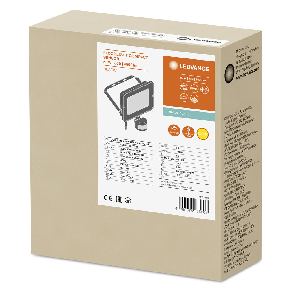 LEDVANCE - Faretto LED con sensore di movimento, 50W, luce calda, simmetria 100 gradi, nero