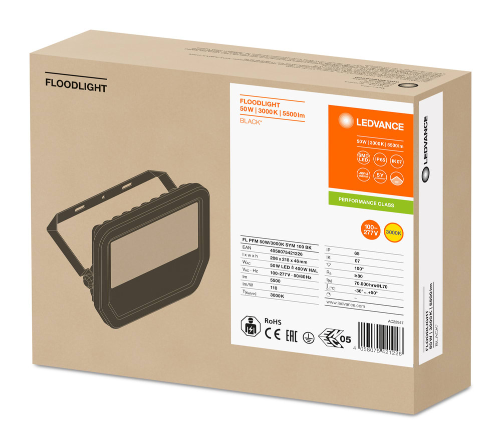 LEDVANCE - Faretto LEDV 50W 3000K, Simmetria 100 BK FLOOD50830BG3
