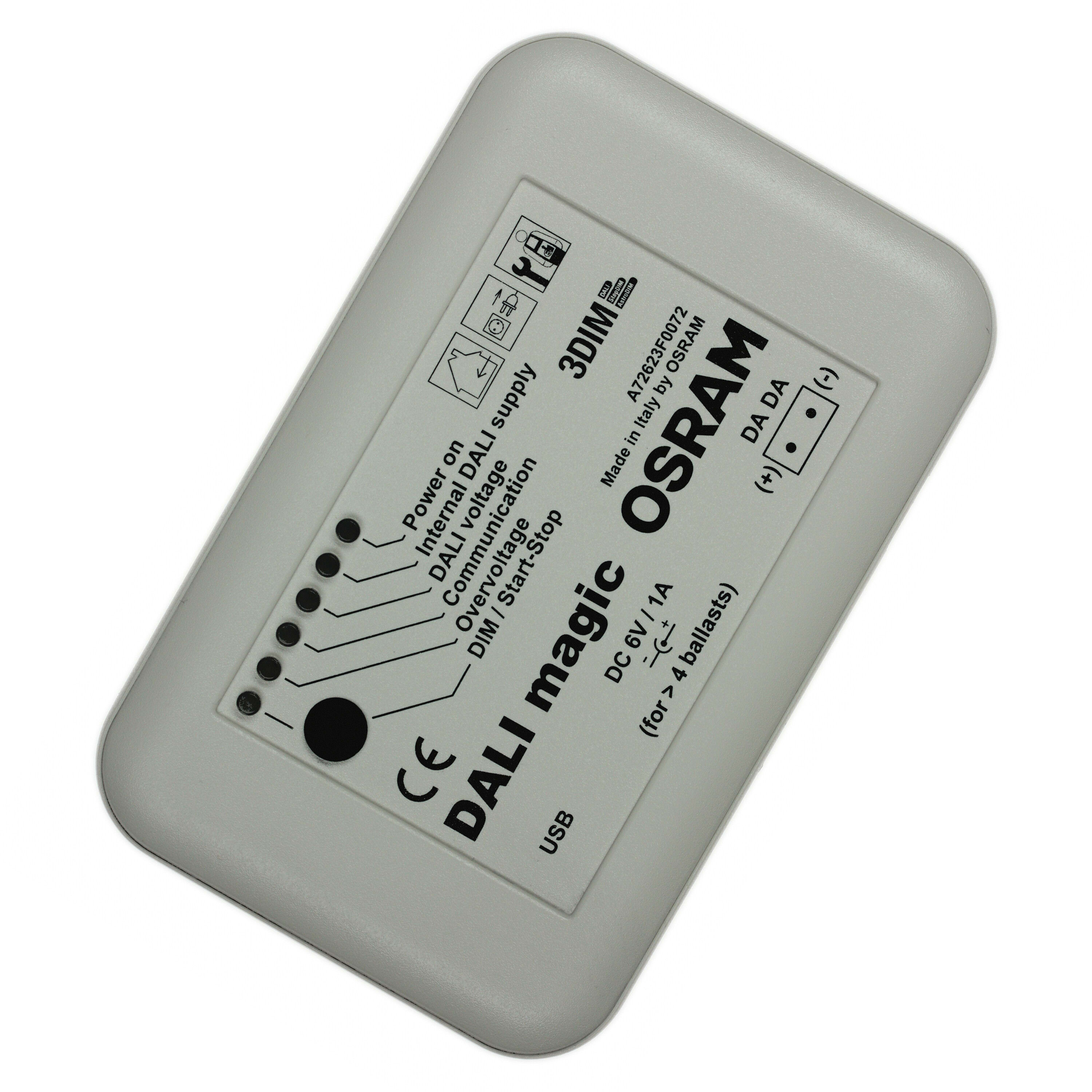 Interfaccia USB per la programmazione DALI. Caratteristiche del prodotto: Convertitore DALI USB per Tuner4TRONIC™ e software guida DALI per PC Windows. Pulsante per testare la regolazione DALI senza bisogno di collegarsi a un computer. Alimentazione con cavo USB o alimentatore universale incluso. Alimentazione automatica integrata DALI per un massimo di 64 dispositivi (fino a 4 con alimentazione tramite cavo USB). Aree di applicazione: Configurazione delle funzioni degli alimentatori elettronici DALI. Monitoraggio degli impianti DALI. Apparecchiatura / Accessori: Alimentatore universale (da 100 a 240 V CA, 5,9 VCC, 1,15 A, spina UE). Cavo USB (maschio A - maschio B), 180 cm. Spina bipolare per collegamento DALI.