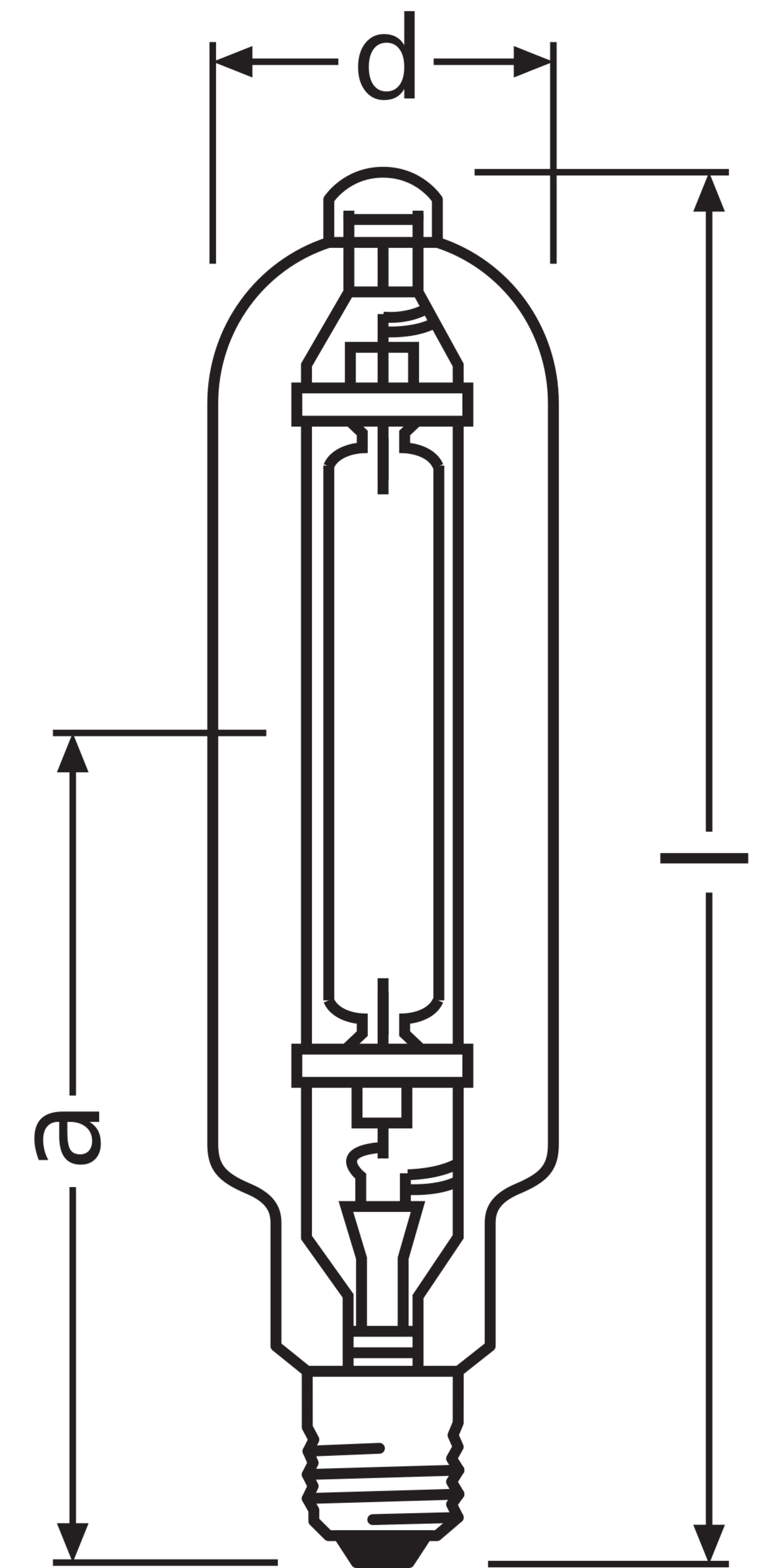Lampade ad alogenuri metallici per apparecchi di illuminazione chiusi. Caratteristiche del prodotto: Tecnologia quarzo POWERSTAR®. Tonalità di luce: neutral white/bianco neutro (N), daylight/diurna (D). Vantaggi del prodotto: Elevata efficienza. Attacco a vite E40 per un semplice impiego della lampada. Valori UV notevolmente inferiori alle soglie massime consentite dalla norma IEC 61167 grazie al filtro UV. Aree di applicazione: Fabbriche e officine. Padiglioni sportivi e padiglioni multiuso. Impianti industriali. Aeroporti. Darsene e strutture portuali. Scali di smistamento, strutture per il trasbordo di container. Approvata solo per apparecchi con schermo frontale di protezione. Applicazioni esterne sono negli apparecchi adatti.