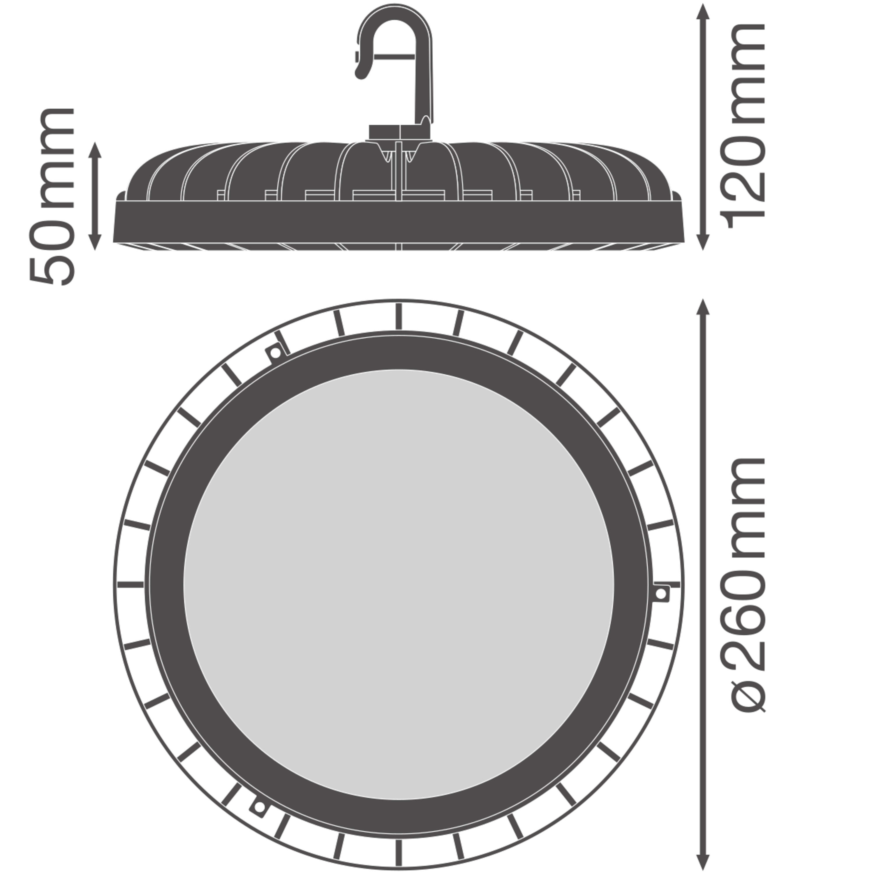High Bay con efficienza fino a 120 lm/W. Caratteristiche del prodotto: Temperatura di esercizio: -20…45 °C. Corpo in alluminio nero, diffusore in vetro temperato. Diffusore opale. Grado di protezione: IP65. Durata (L70): fino a 50.000 ore. Alta efficienza luminosa: fino a 120 lm/W. Vantaggi del prodotto: Design moderno ed esclusivo. Risparmio energetico fino al 60 % rispetto agli apparecchi tradizionali HighBay. Peso e dimensioni ottimizzati per un design compatto. Aree di applicazione: Sostituzione per apparecchi High Bay funzionanti con lampade ai vapori di mercurio e ioduri metallici. Magazzini. Padiglioni logistici. Industria. Soffitti di altezza elevata (ad es. in centri commerciali, aeroporti, edifici commerciali, hall). Apparecchiatura / Accessori: Staffa disponibile. Riflettori disponibili.