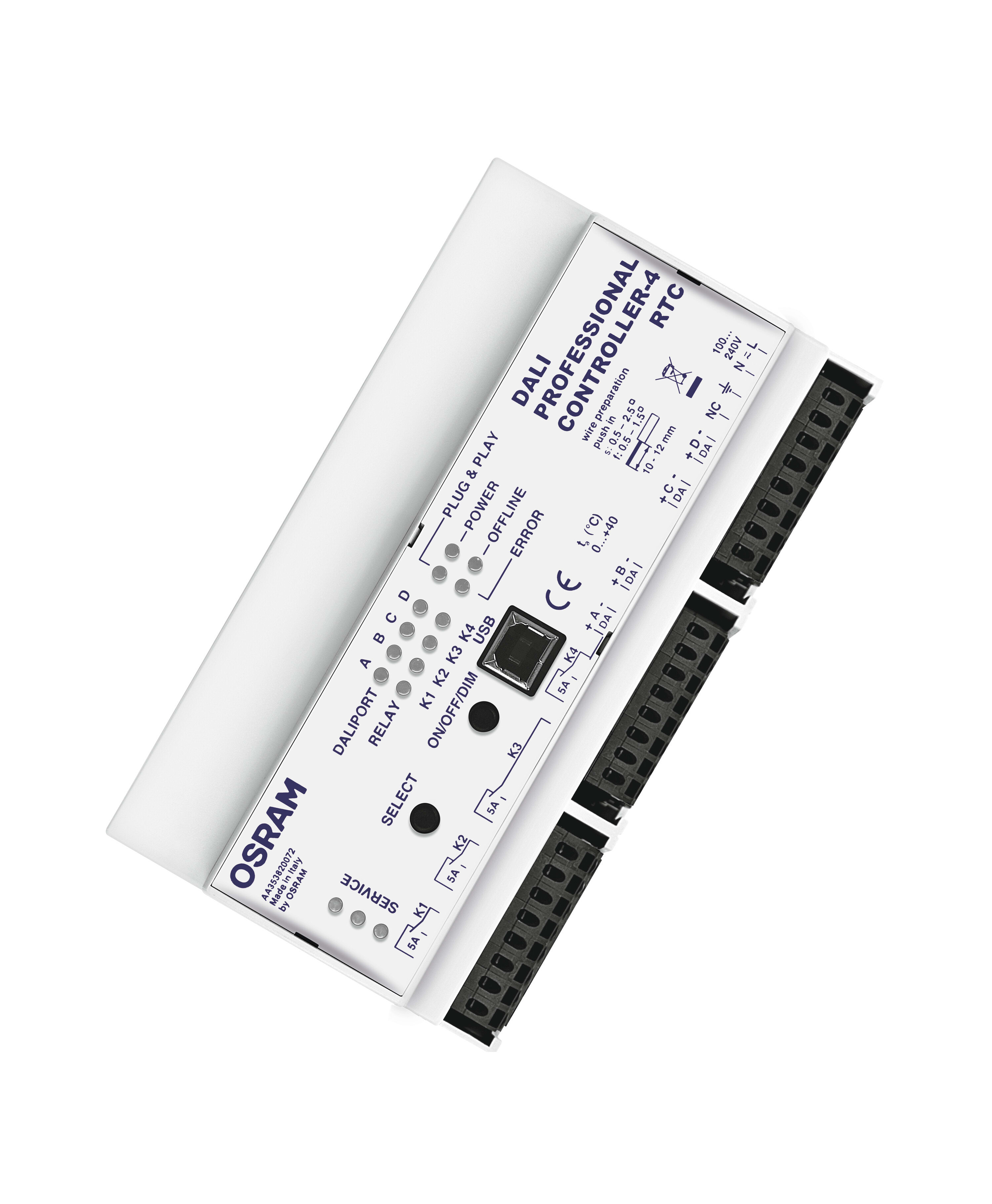 Centraline. Caratteristiche del prodotto: Elemento di controllo per 4 linee DALI. Possibilità di integrare fino a 50 accoppiatori pulsante/sensore. Alimentazione DALI integrata. 4 relè di commutazione programmabili; contatto di carico: 4x 5 A. In funzione della luce naturale e/o della presenza, oppure controllo manuale. Possibilità di controllare fino a 4 x 16 gruppi. Connessione USB al PC. Orologio integrato per il controllo eventi. Scheduler settimanale. Collegamento tramite morsetti a innesto rapido. Controllo delle scene e delle sequenze di luce (richiamo/memorizzazione). 4 linee DALI. Funzione corridoio con programma per l'illuminazione preimpostato. Alloggiamento per installazione in serie. Lunghezza del cavo di controllo DALI: fino a 300 m. Indirizzamento automatico o manuale. Vantaggi del prodotto: Plug and Play preconfigurato per un uso istantaneo senza procedura di accensione. Batteria tampone per l'interruzione della tensione di rete. Possibilità di dimmerazione o commutazione di tutti gli apparecchi di illuminazione dell'impianto. Facile creazione di scene e sequenze. Commutazione e regolazione fino a 256 alimentatori elettronici DALI. Possibilità di memorizzare con un doppio clic un valore nominale per il controllo in funzione della luce naturale. Integrazione dei sensori in DALI. Aree di applicazione: Controllo locali, controllo piani, controllo in funzione della luce naturale. Collegamento di sensori di luminosità e di presenza negli impianti DALI. Sale conferenze. Uffici: postazioni di lavoro singole e di gruppo. Stabilimenti di produzione e assemblaggio. Adatto per applicazioni in interni.. Grandi gruppi di apparecchi. Industria. Corridoi. Strisce luminose. Centri logistici. Aule scolastiche. Padiglioni sportivi. Aule dedicate alla formazione. Apparecchiatura / Accessori: Adatto per un massimo di 256 alimentatori elettronici con interfacce DALI. Software di configurazione grafica con interfaccia utente Windows.