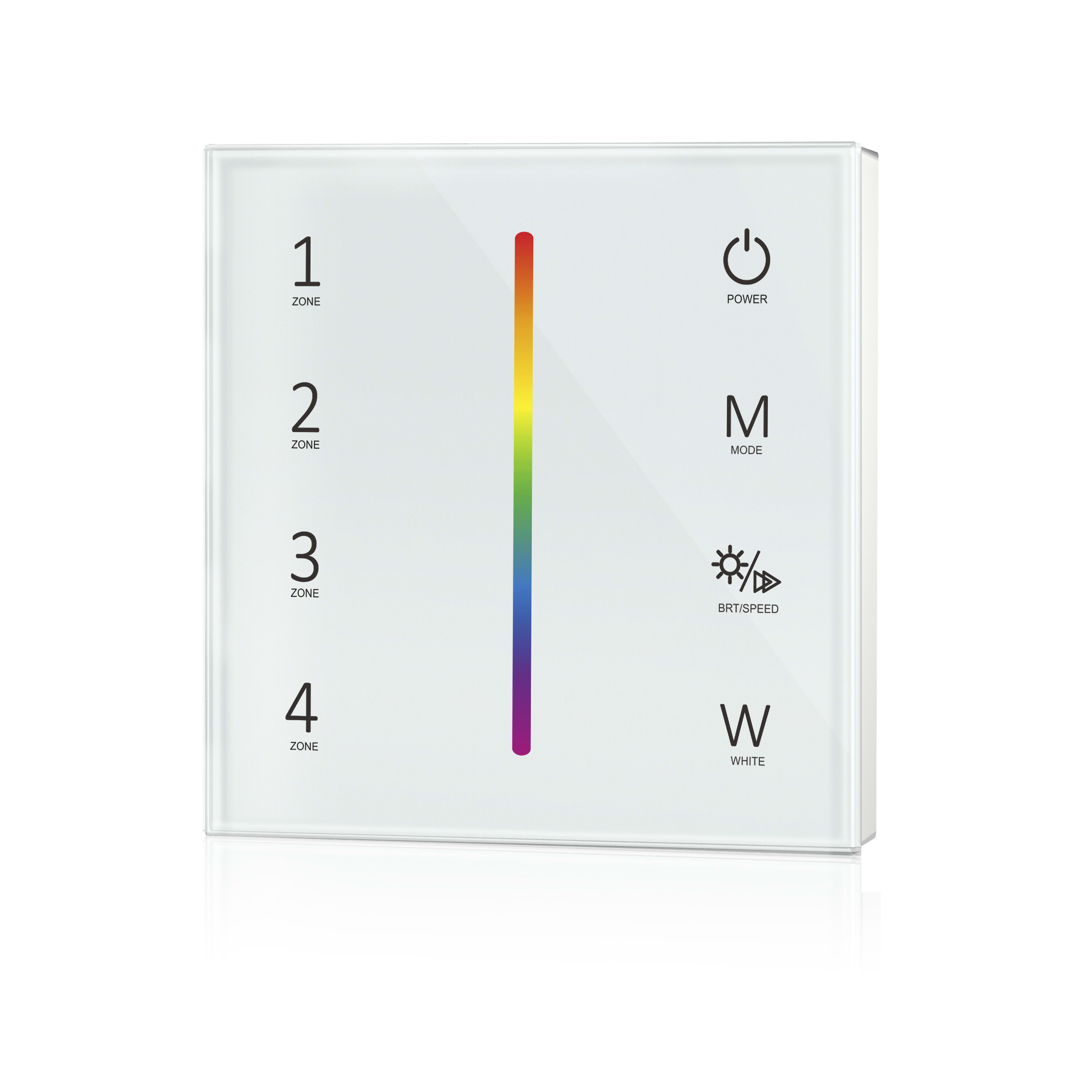 Centralina con tecnologia a radiofrequenza. Caratteristiche del prodotto: Radio wall control Touch panel per il controllo dei moduli LED RGBW. Segnale di uscita: 2,4 GHz. Tensione in ingresso: 100…240 V. Vantaggi del prodotto: Pannello touch in vetro ultra sensibile ad alta resistenza con touch screen della tonalità di luce al centro e retroilluminazione. Dimmerazione dei colori RGB e bianco. 10 gradienti di colore preinstallati. Controlla fino a 4 zone. Controllo separato dei colori rosso, verde, blu e bianco. Facilmente sostituibile per interruttore luci standard. Aree di applicazione: Illuminazione generale. Illuminazione architetturale. Luce dinamica come effetto architettonico in aree pubbliche. Illuminazione di gole. Hotel. Uffici. Interni residenziali.