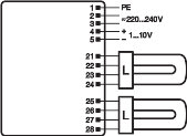 Alimentatore elettronico dimmerabile 1…10 V per CFL (ECG). Caratteristiche del prodotto: Controllo tramite interfaccia 1…10 V. Tensione di alimentazione: 220…240 V. Frequenza di linea: 0 Hz | 50 Hz | 60 Hz. Tensione di linea: 198…264 V. Percentuale di regolazione: 3... 100% del flusso luminoso. Accensione lampada: entro 0,6 sec. Durata utile: > 100.000 ore (per T = 65 °C a Tc). Spegnimento automatico delle lampade difettose al termine della vita (EoL T.2). Indice di efficienza energetica EEI: A1 BAT. Protezione contro la sovratemperatura: gestione termica a temperature tc elevate. Sicurezza: a norma EN 61347-2-3. Funzionamento lampada: in conformità alla norma EN 60929. Soppressione RI: a norma EN 55015:2006+A1:2007+A2:2009/CISPR 15. Armoniche di rete secondo la norma CEI EN 61000-3-2. Immunità elettromagnetica secondo la norma CEI EN 61547. Vantaggi del prodotto: Stesso flusso luminoso sia in corrente continua che in corrente alternata. Perfetta accensione della lampada per applicazioni con sensori di movimento. Regolazione di lampade ad amalgama senza sfarfallio o riduzione della durata. Altissima efficienza grazie alla tecnologia cut-off. Riaccensione automatica dopo la sostituzione della lampada. Gli alimentatori elettronici soddisfano lo standard MINERGIE grazie al consumo in standby molto ridotto. Caratteristiche di alimentazione d'emergenza configurabili. Controllo tramite interfaccia 1…10 V. Aree di applicazione: Adatto per l'impiego in impianti di illuminazione d'emergenza a norma EN 50172/DIN VDE 0108-100. Industria. Uffici open space, corridoi e ripostigli. Edifici pubblici. Adatto per apparecchi di illuminazione con classe di protezione I.