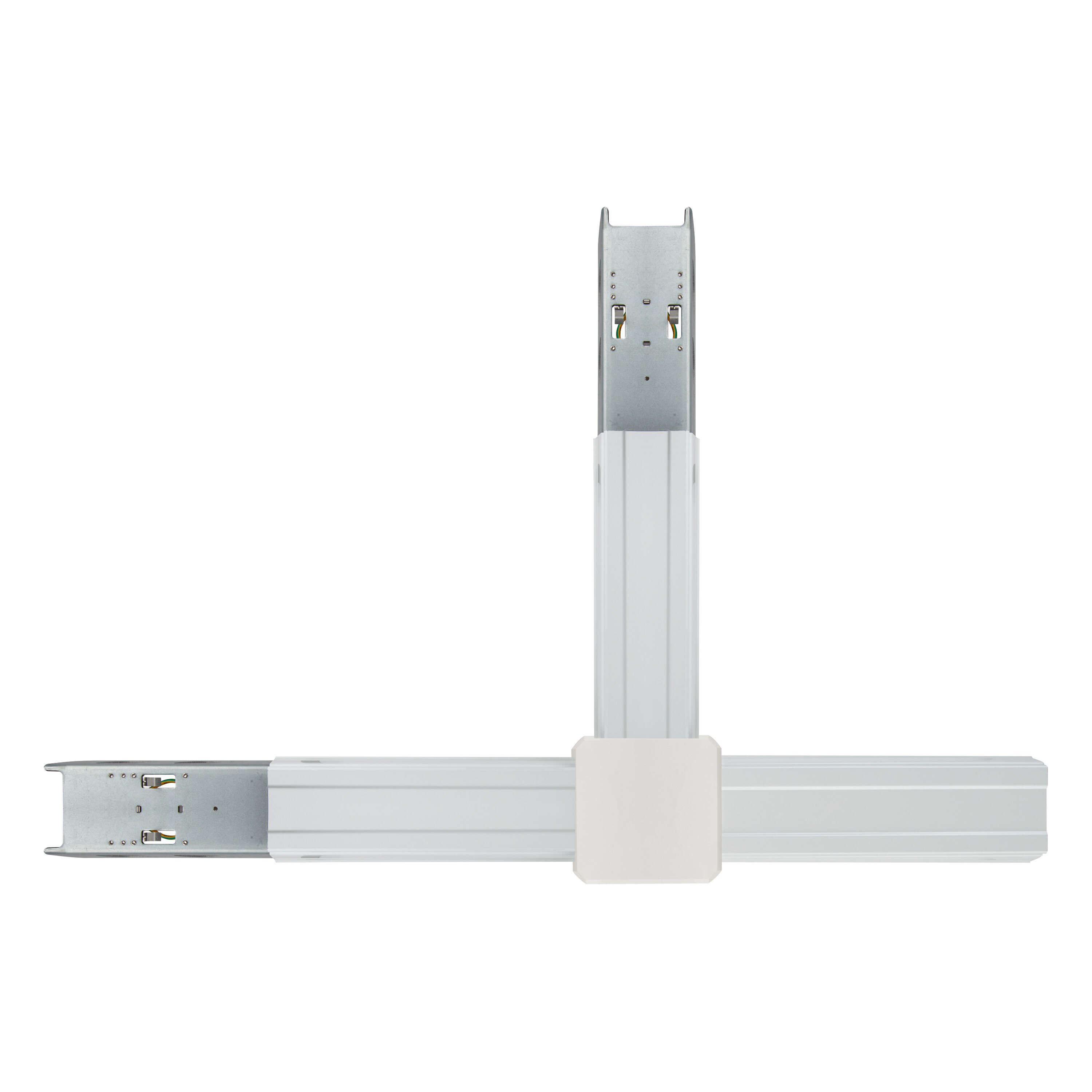 Giunto per binario a T per angoli. Caratteristiche del prodotto: Cablaggio passante con cavo a 5 o 8 conduttori. Un connettore di nodo è costituito da almeno un alimentatore e un'uscita con cablaggio passante. Custodia in lamiera d'acciaio. Vantaggi del prodotto: Semplice installazione.