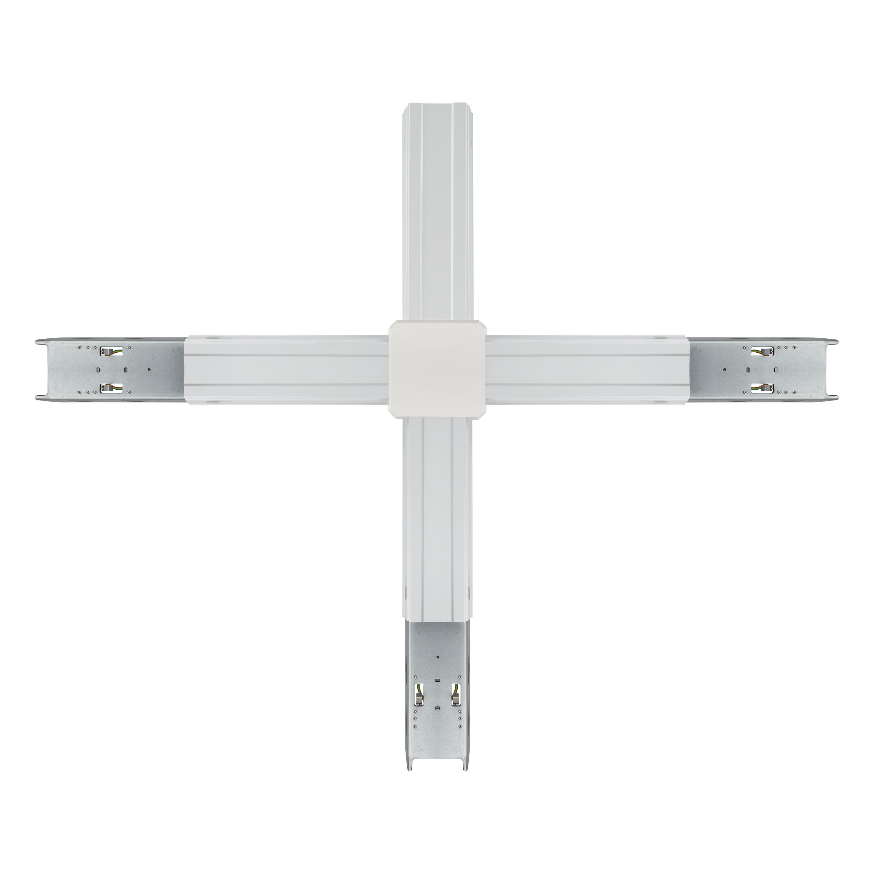 Connettore per binario a forma di X per angoli. Caratteristiche del prodotto: Cablaggio passante con cavo a 5 o 8 conduttori. Un connettore di nodo è costituito da almeno un alimentatore e un'uscita con cablaggio passante. Custodia in lamiera d'acciaio. Vantaggi del prodotto: Semplice installazione.