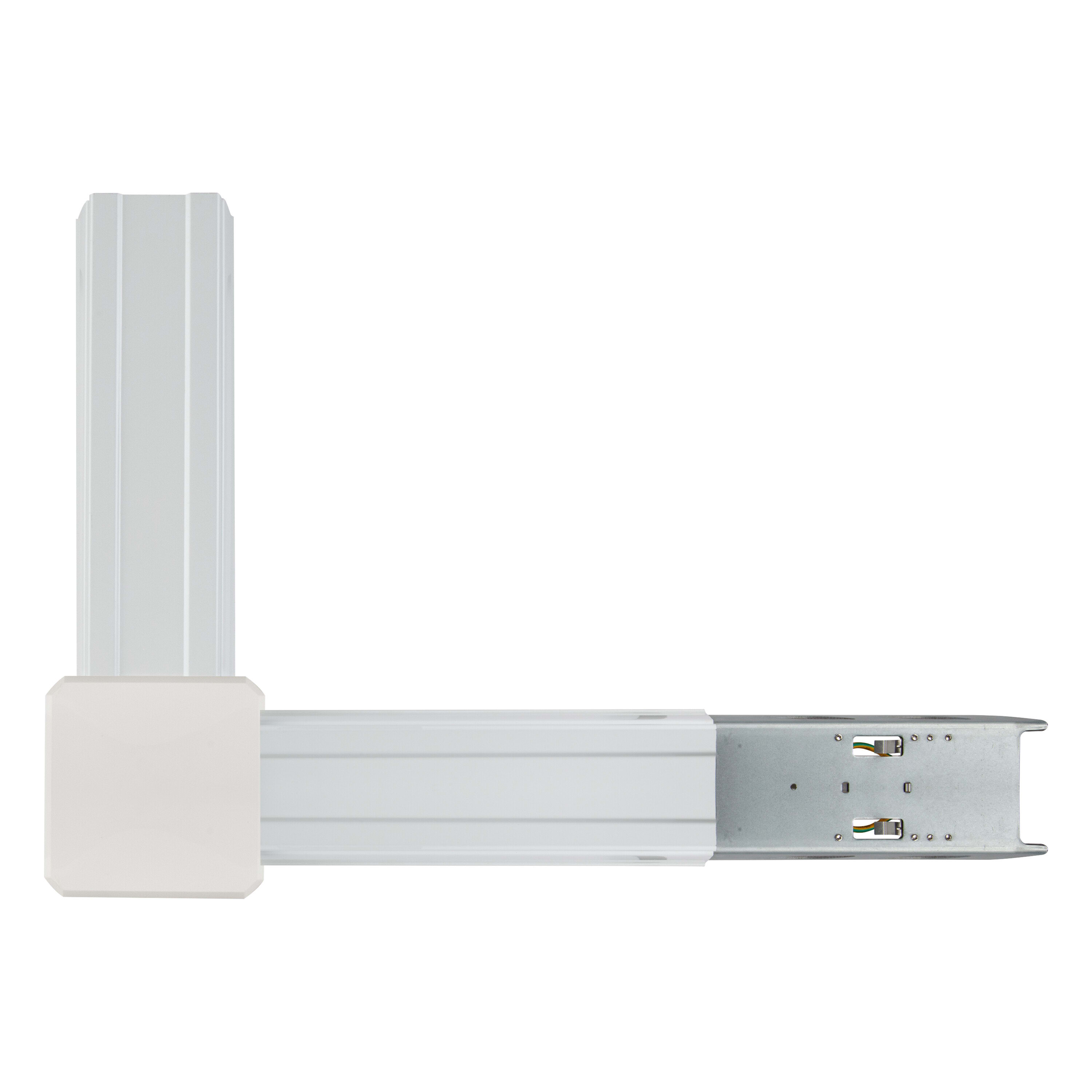 Connettore per binario a L per angoli. Caratteristiche del prodotto: Cablaggio passante con cavo a 5 o 8 conduttori. Un connettore di nodo è costituito da almeno un alimentatore e un'uscita con cablaggio passante. Custodia in lamiera d'acciaio. Vantaggi del prodotto: Semplice installazione.