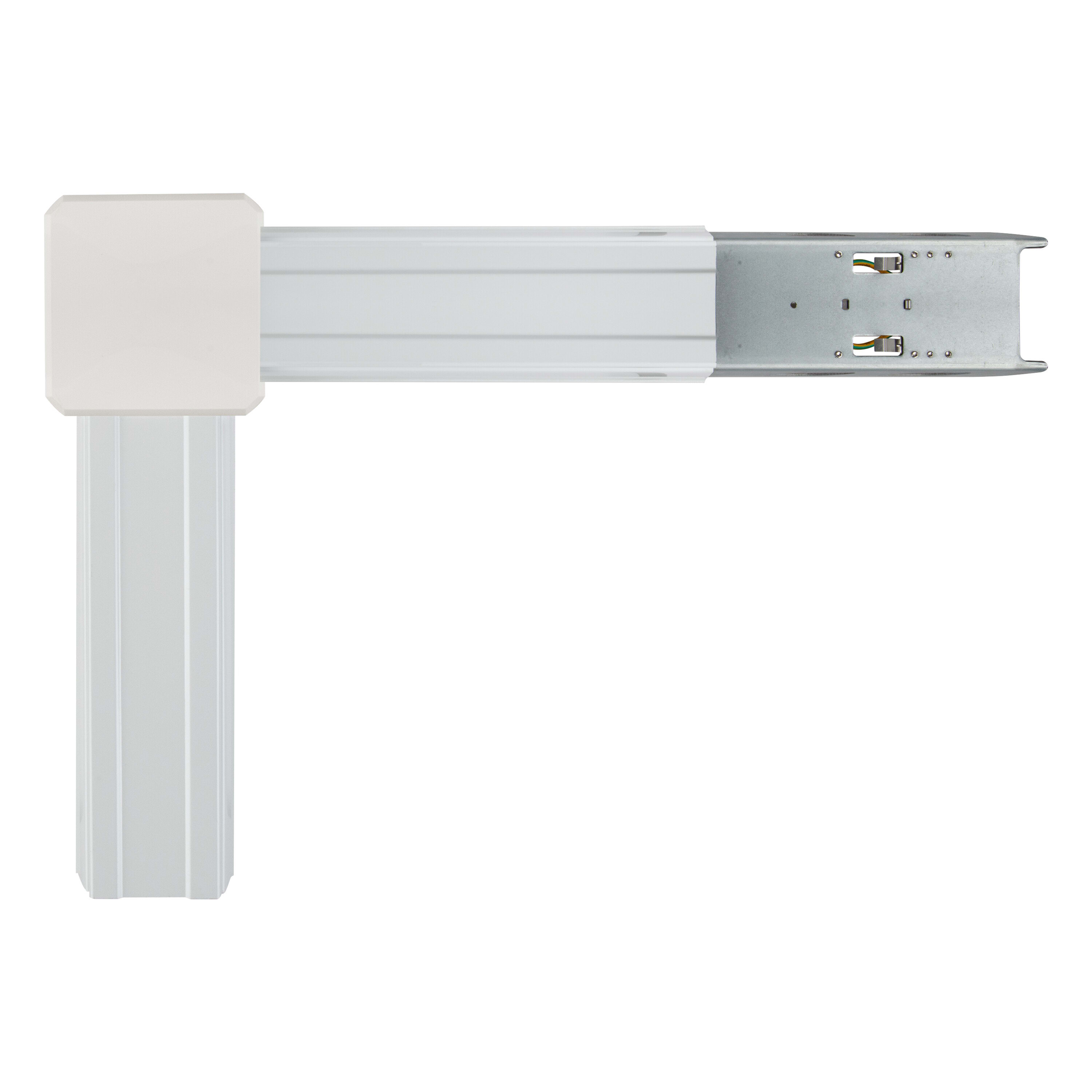 Connettore per binario a L per angoli. Caratteristiche del prodotto: Cablaggio passante con cavo a 5 o 8 conduttori. Un connettore di nodo è costituito da almeno un alimentatore e un'uscita con cablaggio passante. Custodia in lamiera d'acciaio. Vantaggi del prodotto: Semplice installazione.