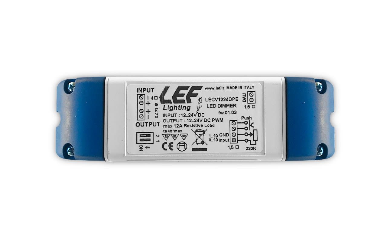 LEF LIGHTING - INTERFACCIA DIMMERAZIONE x LED IN TENSIONE 12-24V 12A IP20 DIM.DALI/PUSH/0/1-10 LECV1224DPE