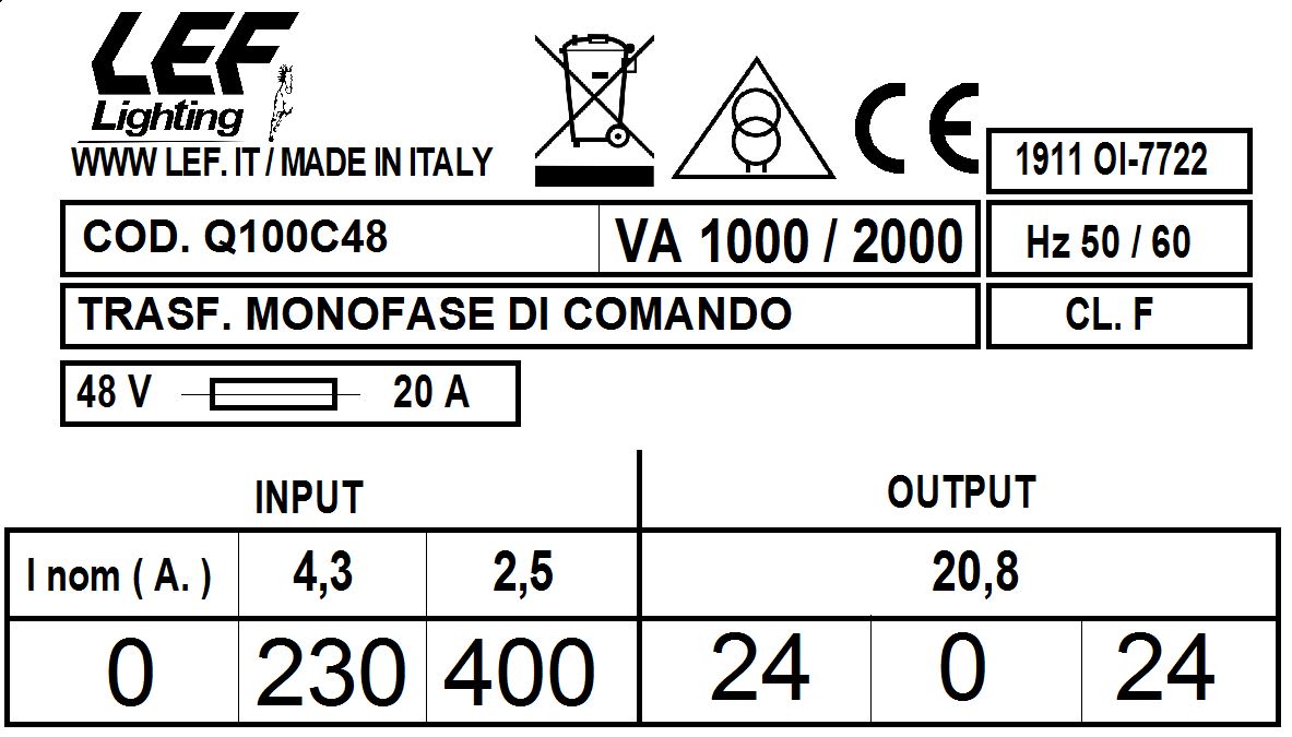LEF LIGHTING - TRASFORMATORE 1000VA 230.400V / 24.0.24V MONOFASE DI COMANDO E SICUREZZA