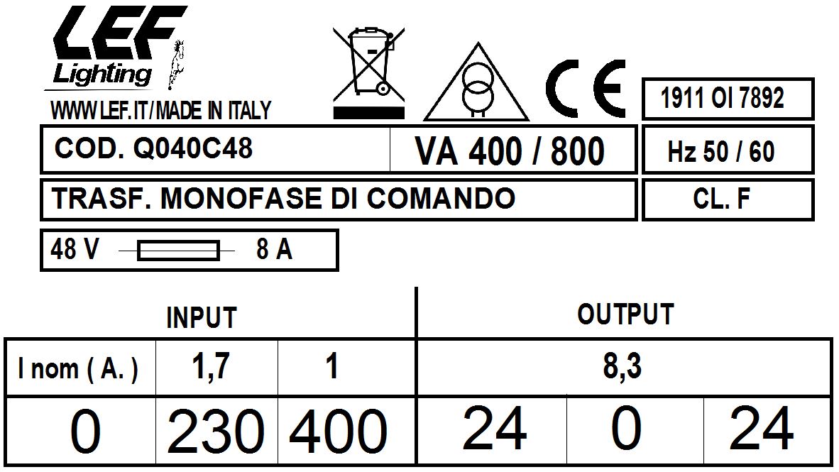 LEF LIGHTING - TRASFORMATORE 400VA 230.400V / 24.0.24V MONOFASE DI COMANDO E SICUREZZA