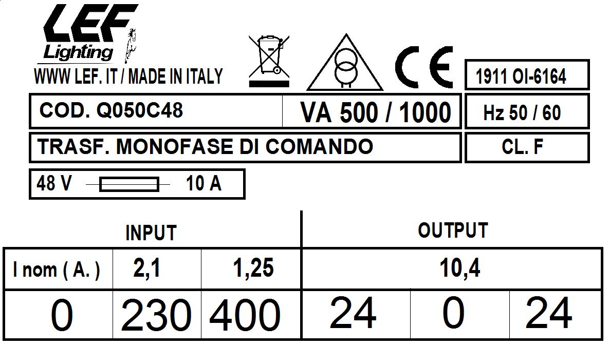 LEF LIGHTING - TRASFORMATORE 500VA 230.400V / 24.0.24V MONOFASE DI COMANDO E SICUREZZA