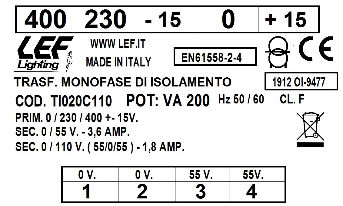 LEF LIGHTING - TRASFORMATORE MONOFASE 200VA 230.400V / 55÷110V