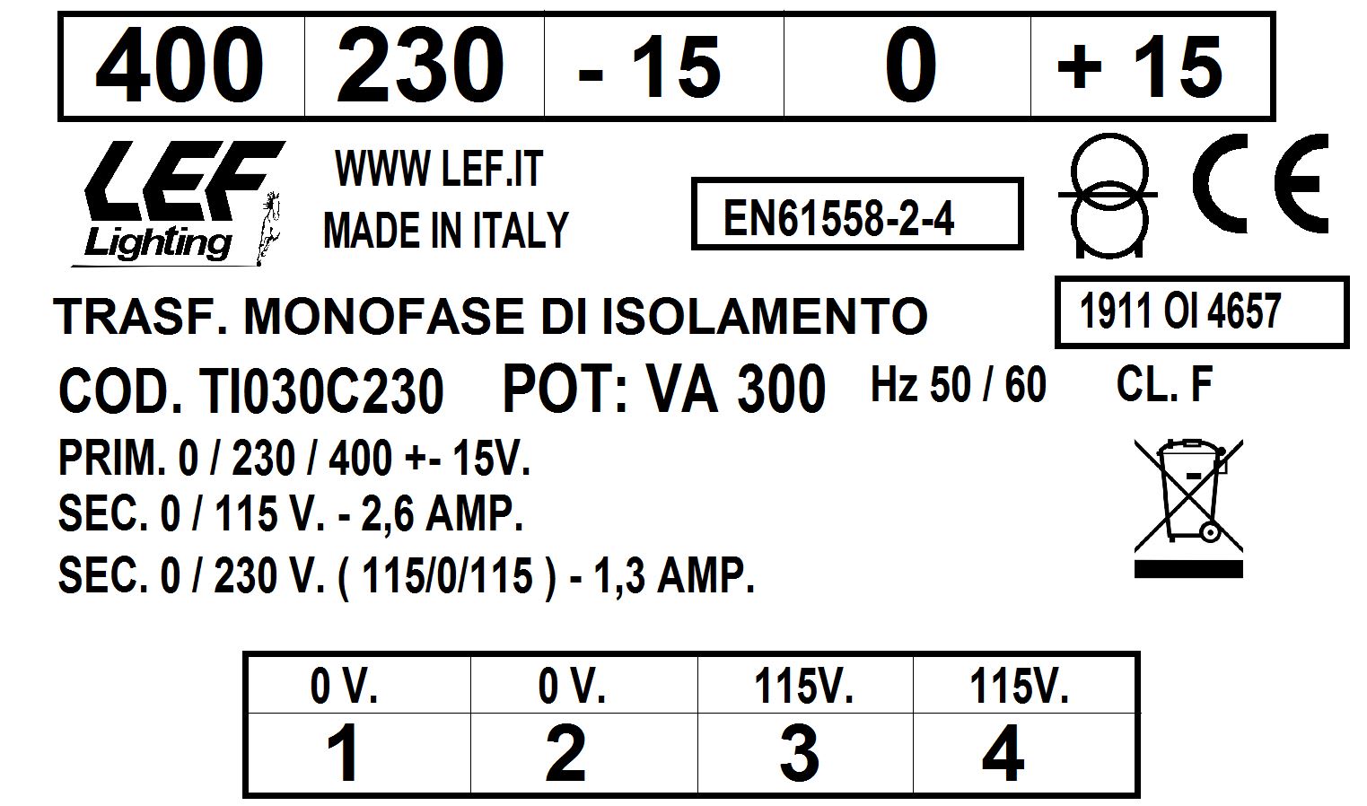 LEF LIGHTING - TRASFORMATORE MONOFASE 300VA 230.400V / 115÷230V