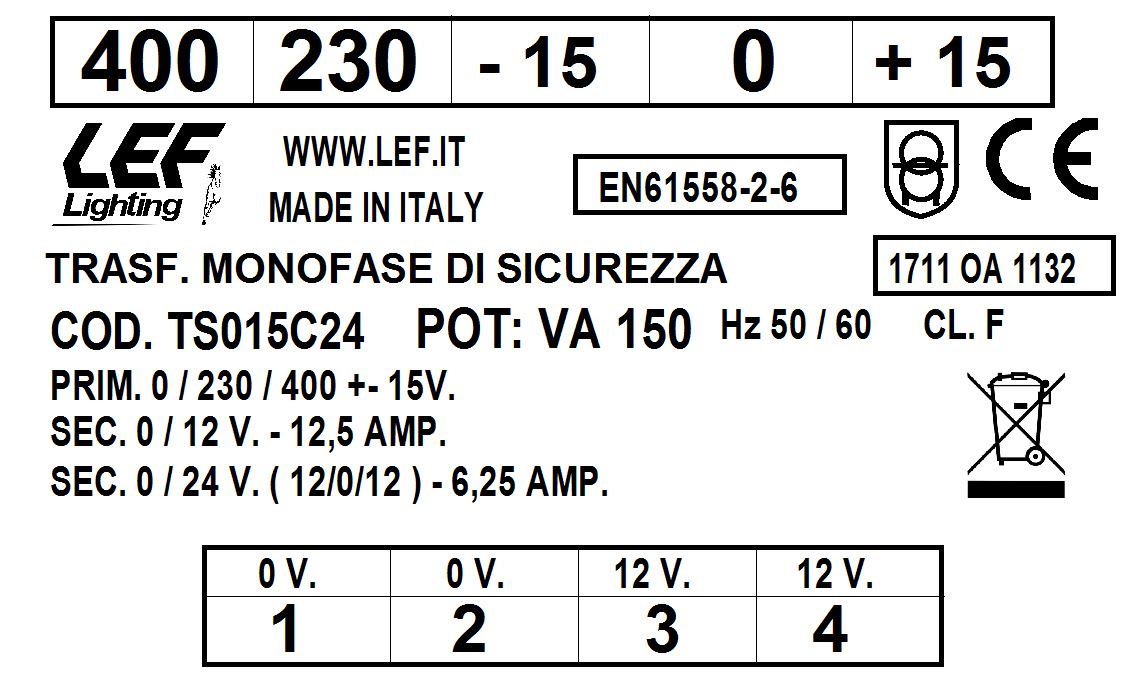 LEF LIGHTING - TRASFORMATORE MONOFASE DI SICUREZZA 150VA 230.400V / 12÷24V TS015C24