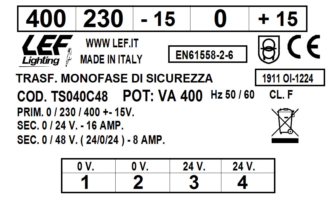 LEF LIGHTING - TRASFORMATORE MONOFASE DI SICUREZZA 400VA 230.400V / 24-48V
