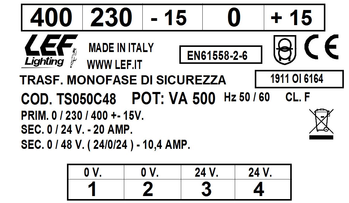 LEF LIGHTING - TRASFORMATORE MONOFASE DI SICUREZZA 500VA 230.400V / 24-48V