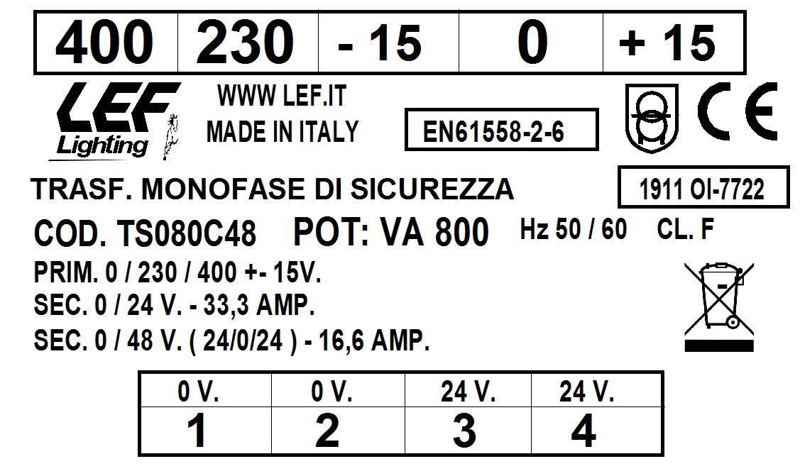 LEF LIGHTING - TRASFORMATORE MONOFASE DI SICUREZZA 800VA 230.400V / 24-48V