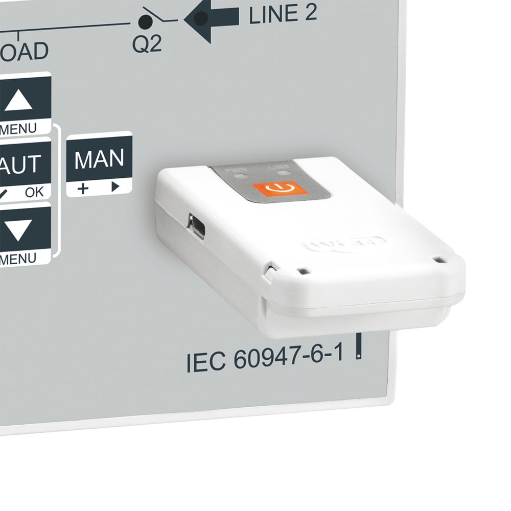 Connettore frontale USB per la programmazione/gestione ATS. Isolamento galvanico per connessioni sicure garantito tramite comunicazione a infrarossi con porta frontale centrale.