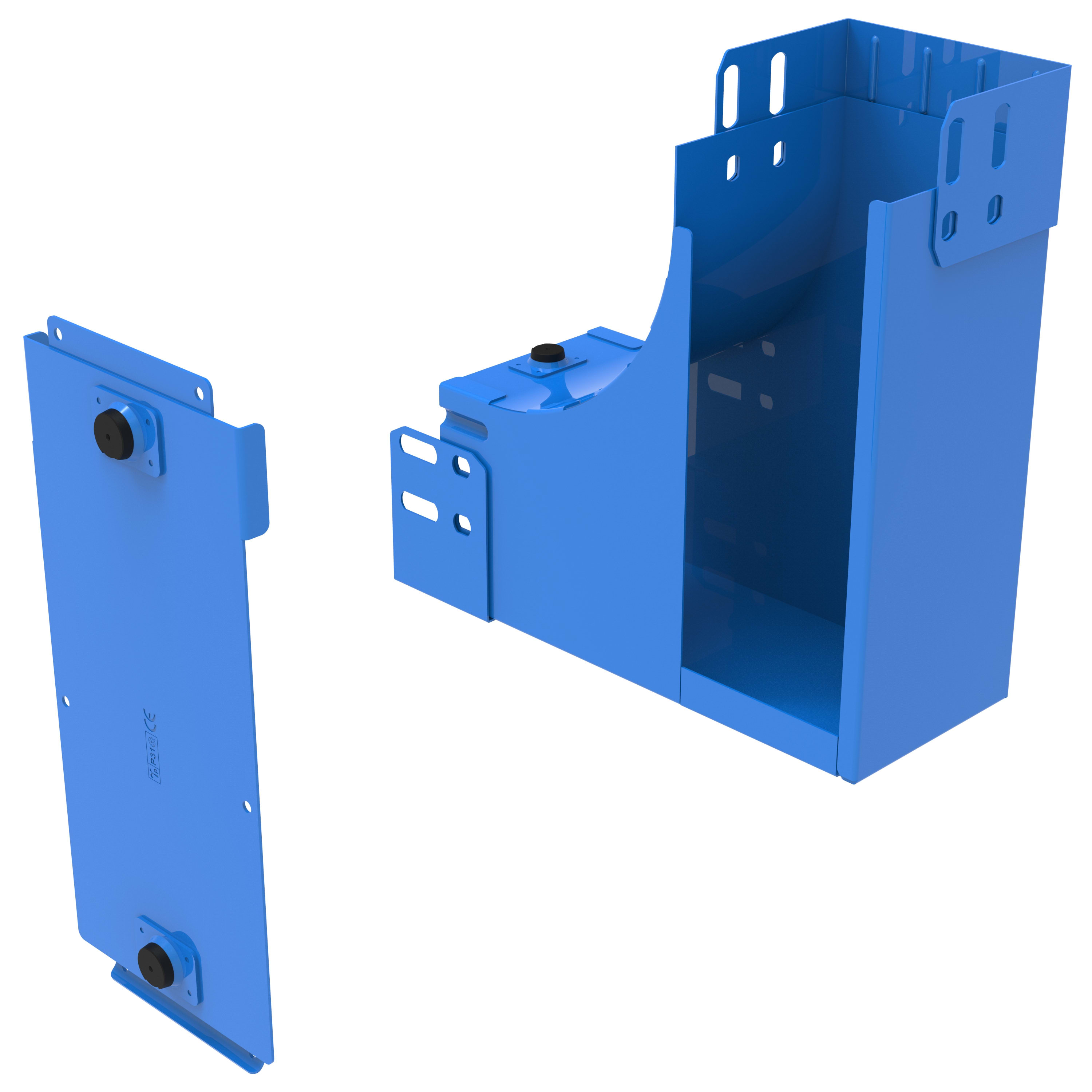 Curva sinistra in salita a 90° con variazione di piano, completa di coperchio. Altezza: 100 mm. Larghezza: 100 mm. Finitura G: Acciaio smaltato blu Gamma-P.