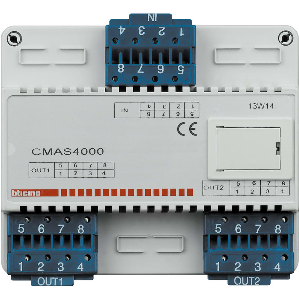 Modulo espansore di camera. Il dispositivo consente la connessione sino a 4 pulsantiere paziente o 4 tiranti bagno oltre a quello già disponibile. Il CMAS4000 deve essere utilizzato con i terminali di camera art.CMTE1100 e CMTE1200.