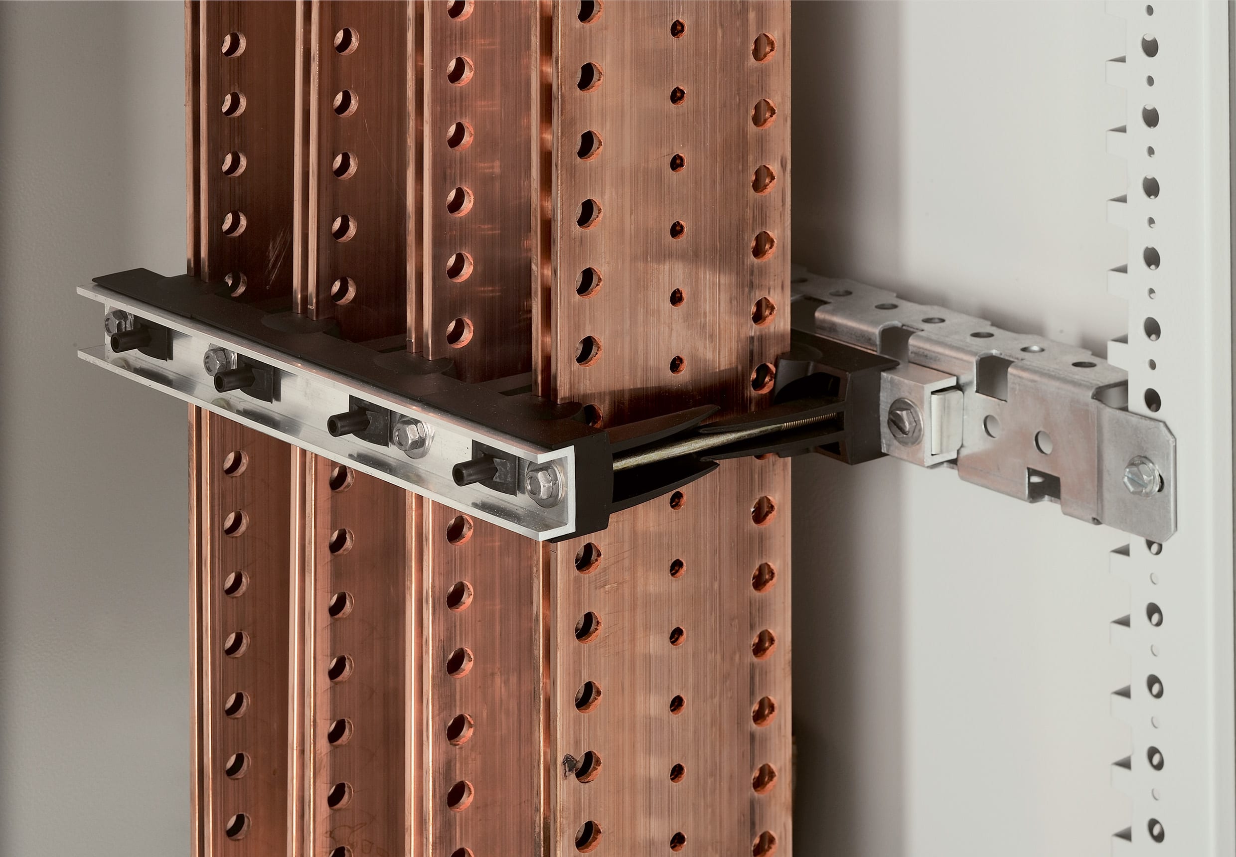 Supporto per barre 1600 A piatte in rame 50x5, 63x5, 75x5 e 80x5, 100x5 mm in posizione allineata per realizzare un kit di barre principali orizzontali, verticali o sul fondo dell\'armadio.
