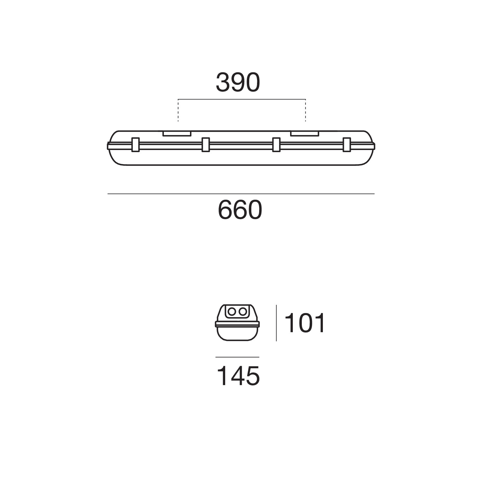 Plafone a singola emissione per applicazione outdoor. Lampadina LED inclusa, attacco 2xG13 (T8 LED tube). Il corpo dell'apparecchio, realizzato in policarbonato, presenta una finitura di colore grigio, il diffusore è prodotto in policarbonato uv resistente. Il grado di protezione è IP66, il peso complessivo è di 1.1 kg. L'apparecchio presenta una classe di isolamento I ed è installabile a soffitto. Conforme alla norma EN 60598-1 e alle relative prescrizioni particolari.
