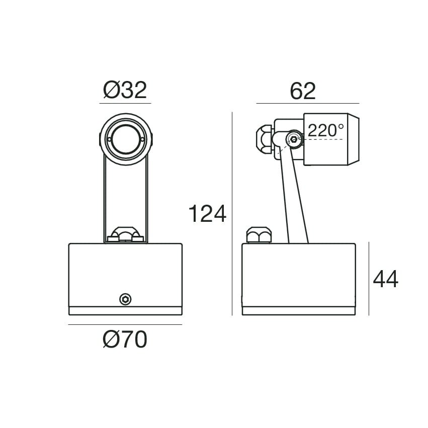 Proiettori a singola emissione per applicazione outdoor. La sorgente luminosa LED, di colore bianco caldo, con distribuzione luminosa Adjustable Focus, è composta da 1 LED powerled, con una CCT 3000 K ed un CRI 80, il flusso luminoso della sorgente è di 233 lm, con un'efficienza nominale di 116.5 lm/W. Il corpo dell'apparecchio, realizzato in ottone ot58, presenta una finitura di colore nichel, ottenuta tramite nichelatura galvanica + spazzolatura, il diffusore è prodotto in vetro extra chiaro. Il grado di protezione è IP65, il peso complessivo è di 0.59 kg. La potenza assorbita dall'apparecchio è di 2.2 W. Il cavo per l'alimentazione è incluso e presenta una lunghezza di 1 m. L'apparecchio presenta una classe di isolamento I ed è installabile a parete, soffitto o pavimento. Conforme alla norma EN 60598-1 e alle relative prescrizioni particolari.