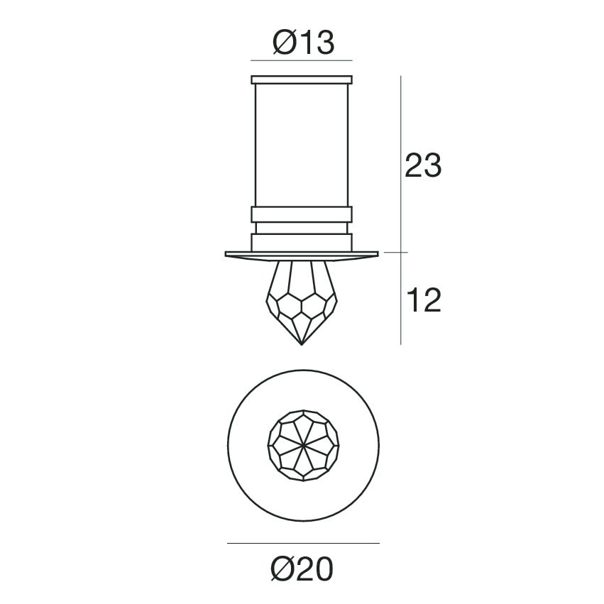 Downlights a singola emissione per applicazione indoor. La sorgente luminosa LED, di colore bianco caldo, con distribuzione luminosa Diffusa, è composta da 1 LED 5mmled, con una CCT 3000 K ed un CRI 75. Il corpo dell'apparecchio, realizzato in ottone, presenta una finitura di colore cromo, ottenuta tramite galvanostegia, il diffusore è prodotto in cristallo. Il grado di protezione è IP20, il peso complessivo è di 0.015 kg. Il driver d’alimentazione non è fornito e deve essere ordinato separatamente. La potenza assorbita dall'apparecchio è di 0.5 W. Il cavo per l'alimentazione è incluso e presenta una lunghezza di 0.12 m. L'apparecchio presenta una classe di isolamento III ed è installabile a soffitto, con foro tondo di diametro 15 mm (nel cartongesso). Conforme alla norma EN 60598-1 e alle relative prescrizioni particolari. CAM EDILIZIA: Affidamento del servizio di progettazione di interventi edilizi secondo quanto riportato dal ''decreto 23 giugno 2022'' pubblicato nella ''Gazzetta Ufficiale della Repubblica Italiana'' serie generale n°183 in vigore dal 18/10/2017 rispetta nello specifico i seguenti criteri: 2.4.3: Impianti di illuminazione per interni.