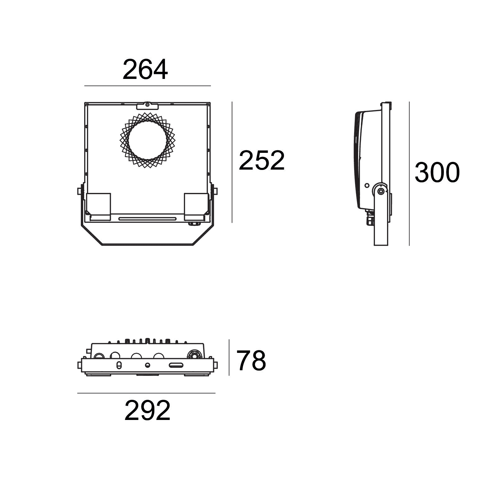 Proiettori a singola emissione per applicazione outdoor. La sorgente luminosa LED, di colore bianco naturale, con distribuzione luminosa Extra Wide Flood, è composta da 1 LED arrayled, con una CCT 4000 K ed un CRI 80, il flusso luminoso della sorgente è di 10528 lm, con un'efficienza nominale di 148.3 lm/W. Il corpo dell'apparecchio, realizzato in alluminio pressofuso en ab - 46100, presenta una finitura di colore nero, ottenuta tramite verniciatura a polvere, il diffusore è prodotto in vetro extra chiaro - temprato, con una lavorazione di serigrafia. Il grado di protezione è IP66, il peso complessivo è di 3.8 kg. La potenza assorbita dall'apparecchio è di 80 W. L'apparecchio presenta una classe di isolamento I ed è installabile a parete, soffitto o pavimento. Conforme alla norma EN 60598-1 e alle relative prescrizioni particolari.