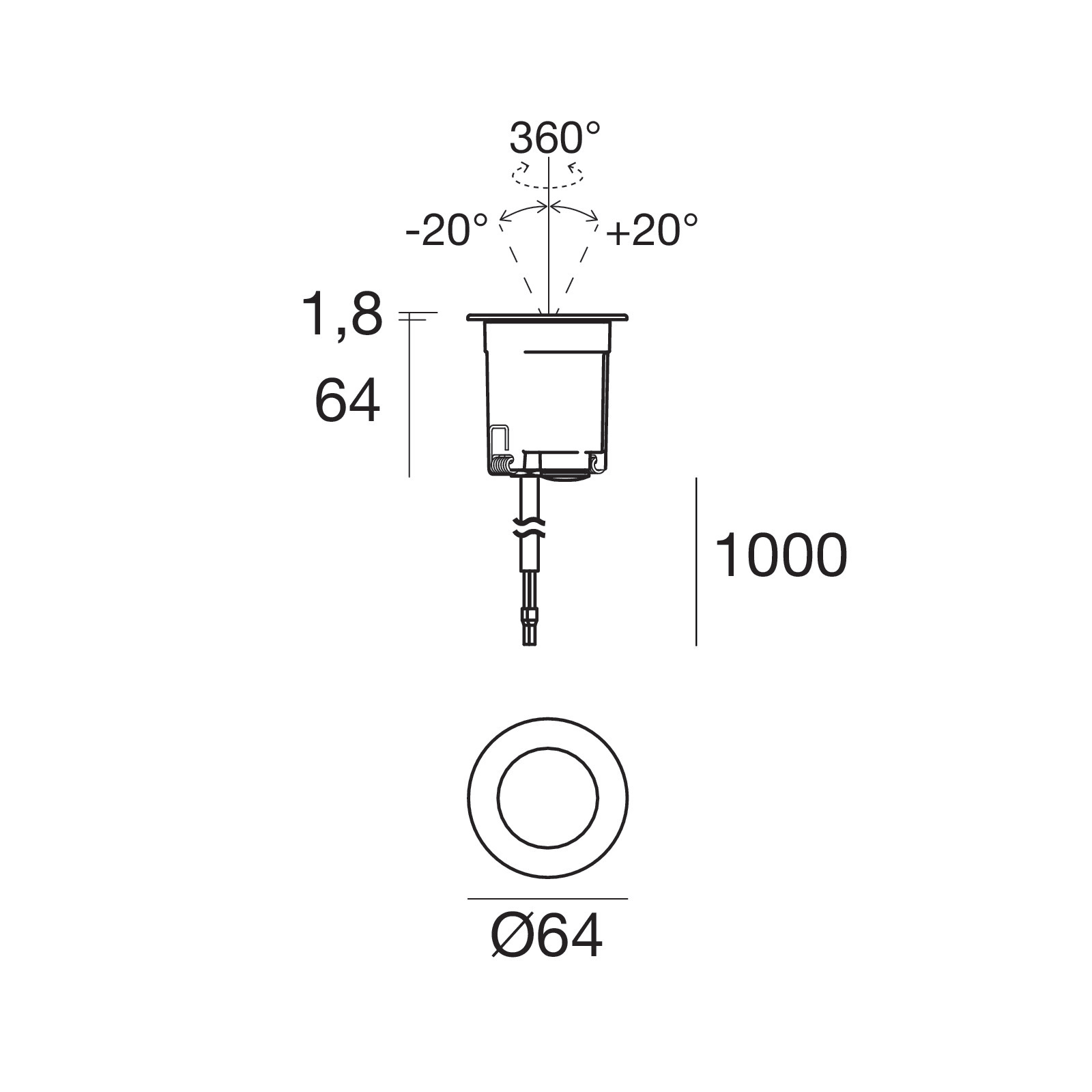 Uplights a singola emissione per applicazione outdoor. La sorgente luminosa LED, di colore bianco caldo, con distribuzione luminosa Medium Flood, è composta da 1 LED powerled, con una CCT 3000 K ed un CRI 80, il flusso luminoso della sorgente è di 490 lm, con un'efficienza nominale di 122.5 lm/W. Il corpo dell'apparecchio, realizzato in alluminio pressofuso en ab - 46100, presenta una finitura di colore nero ral 9005 opaco, ottenuta tramite anodizzazione poro aperto + verniciatura a polvere, il diffusore è prodotto in vetro extra chiaro - temprato. Il grado di protezione è IP68, il peso complessivo è di 0.310 kg. Il driver d’alimentazione non è fornito e deve essere ordinato separatamente. La potenza assorbita dall'apparecchio è di 4 W. Il cavo per l'alimentazione è incluso e presenta una lunghezza di 1 m. L'apparecchio presenta una classe di isolamento III ed è installabile a pavimento. Conforme alla norma EN 60598-1 e alle relative prescrizioni particolari.